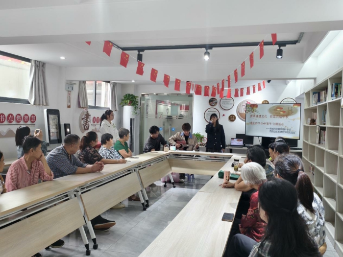 活动伊始,来自桐城师专艺术与设计系的余婧怡同学,结合校级人文社科青年项目成果,给社区居民朋友们带来桐城歌专题讲解,以“非遗传统与现代高校双向奔赴”为核心,开启了桐城歌的文化科普之旅。通过讲解的方式,把这份文化感悟带到社区,让非遗真正“活”在生活里。台下,居民们也纷纷点头,对这份“家门口的非遗文化”生出浓厚兴趣。