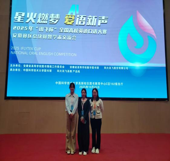 10月25日,以“星火燃梦·AI语新声”为主题的2025年“讯飞杯”全国高校英语口语大赛安徽赛区总决赛在中国科学技术大学举行,我校学子朱梓靓、王文静同学凭借扎实的语言功底与出色的现场表现荣获一等奖,图书馆荣获“最佳组织奖”,朱梓靓、王文静同学代表高职高专组发表获奖感言并分享交流经验,充分展现了我校学子的风采。