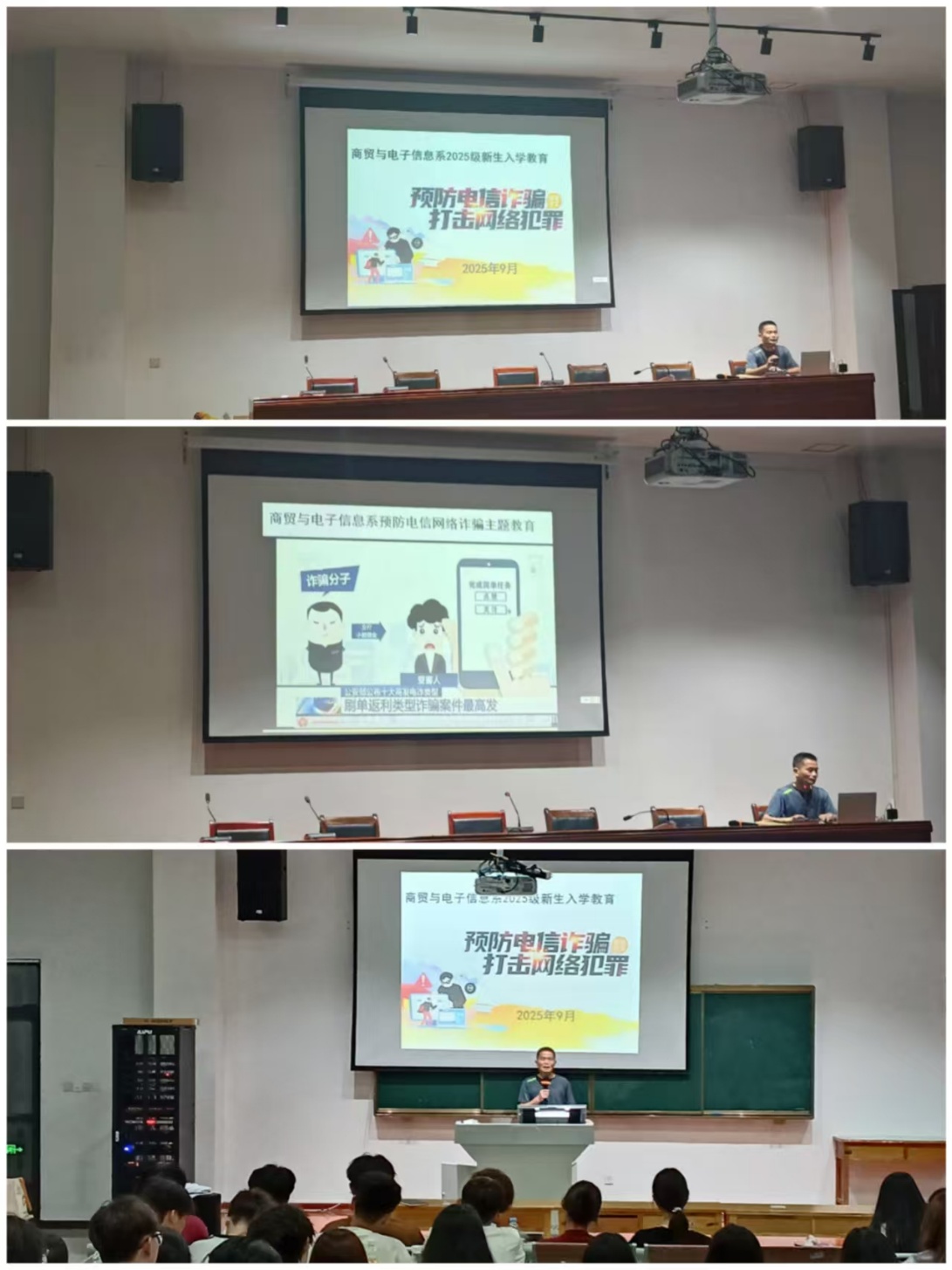 为帮助新生快速提升反诈意识,筑牢校园安全防线,9月9日晚,我系面向2025级全体新生开展反诈宣传“第一课”活动。活动由系党总支副书记殷海红主讲,通过沉浸式、接地气的宣讲,为刚踏入校园的新生们系好入学后的“安全第一粒扣子”。