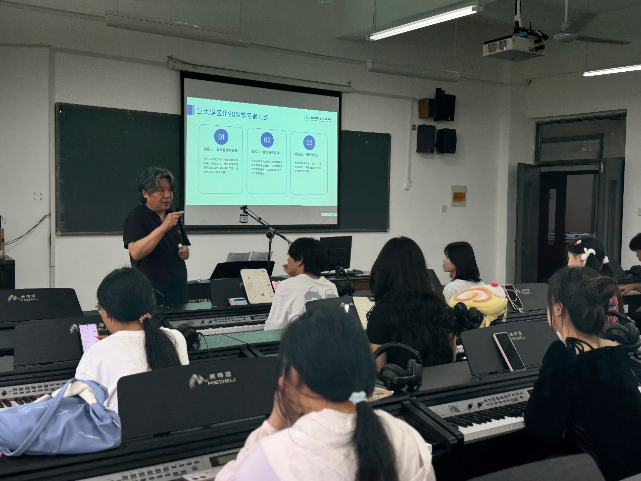 主讲人王雨辰副教授以扎实的理论功底与生动的实践演示,为我校学生拆解即兴伴奏的核心逻辑,破除 “玄学” 误解,构建从基础到进阶的训练体系,让现场学子在沉浸式学习中掌握 “即兴创作” 的实用方法。