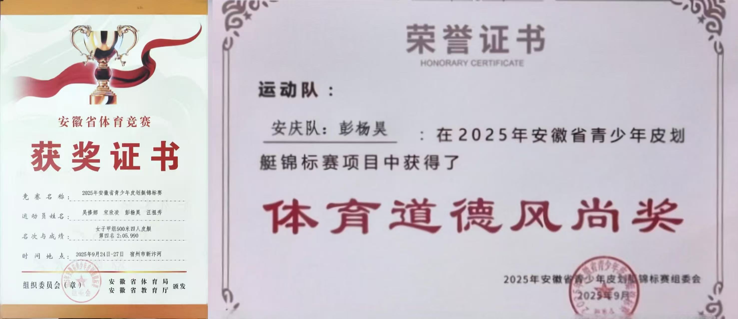 在此比赛中,彭杨昊不仅在竞技成绩上崭露头角,与队友们团结协作、劈波斩浪,最终荣获第四名。更凭借“尊重对手、遵守规则、拼搏进取”的优秀表现,荣获体育道德风尚奖,用行动诠释了“友谊第一、比赛第二”的体育真谛,印证了她恪守体育道德的优良品格。以拼搏为笔,绘就体育精神的璀璨星河。充分体现了“德、智、体、美、劳”的优秀美德!