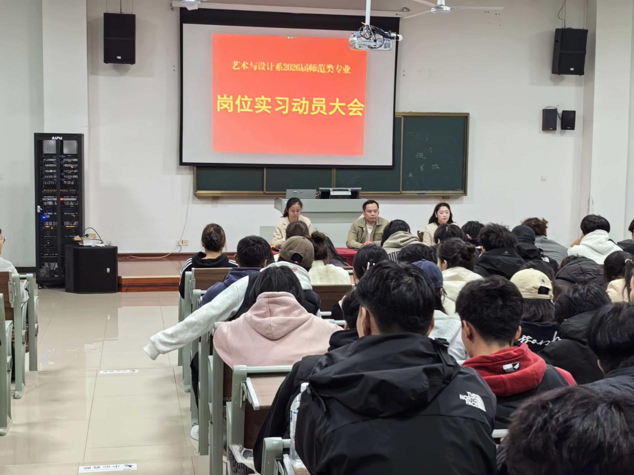 为明确实习任务、凝聚实习共识,确保师范生岗位实习工作顺利推进,艺术与设计系于11月10日在以智楼报告厅隆重召开2026届师范类专业岗位实习动员大会。系部领导周琳、孙禺慧及全体实习指导老师出席会议,2026届全体师范生参会,会议由张倩主持。