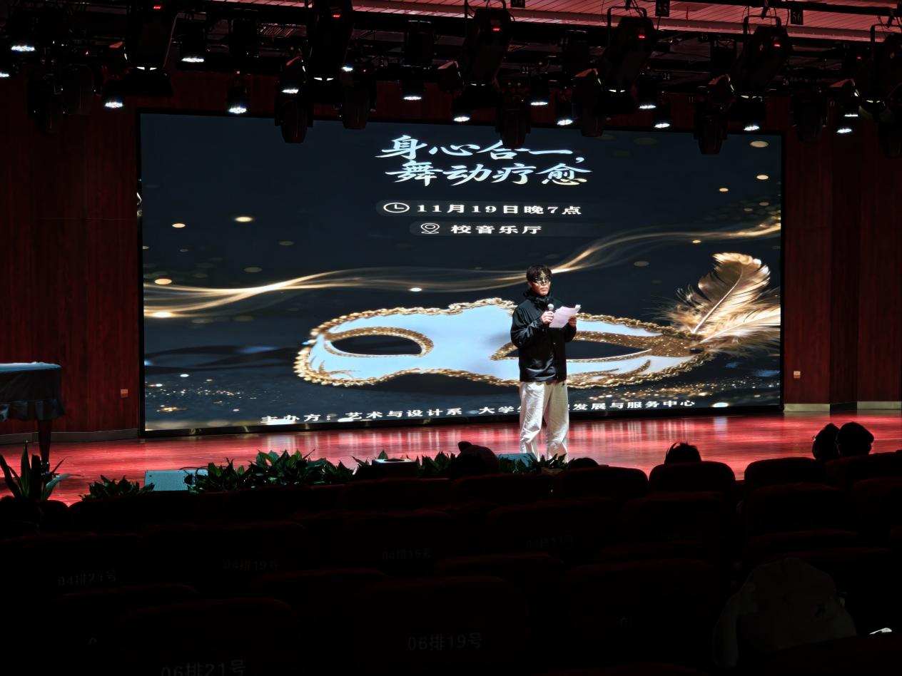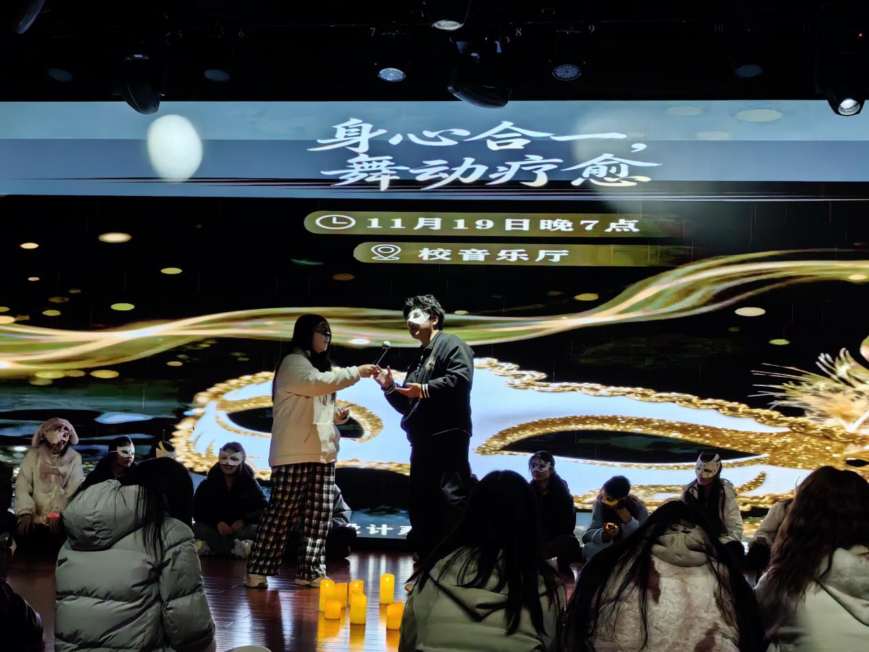 为深化心理育人理念,丰富学生校园生活,全方位提升学生身心素养为帮助学生缓解社交压力、实现身心放松,艺术与设计系于2025年11月19日晚在音乐厅举办“身心合一·舞动疗愈”假面舞会活动,来自艺设系各年级各专业的46同学参与其中。