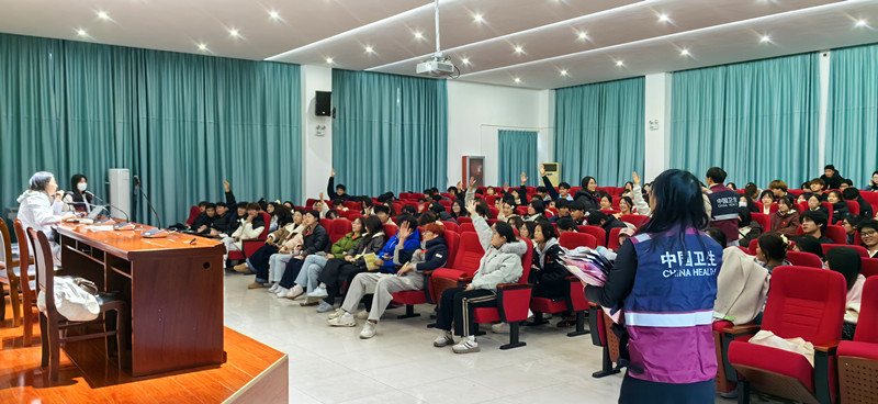 讲座结束后,互动环节有序开展,氛围热烈庄重。师生们在主题横幅上签名明志,佩戴红丝带传递关爱与责任;有奖竞答聚焦防艾核心知识点,师生踊跃抢答,现场发放宣传手册,有效巩固普及实效。